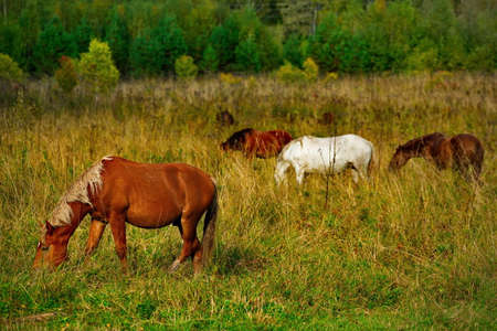 Herd of white horses on pasture in forest. Mare grazing grass outdoors