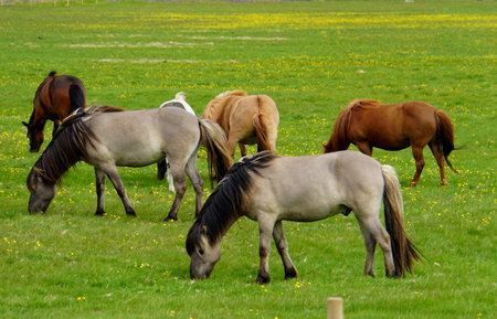 The Icelandic horse is a breed of horse grown in Iceland. Herds of horses graze freely on a huge field surrounded by rocky mountains with snow-capped peaks.