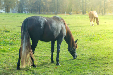 Modern animal livestock. Horses grazing in green field grassland farm countryside background. Horse in meadow chewing grass outdoor. Horse in natural eco farm. Herd of horses on green pasture