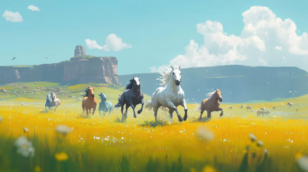 A dynamic scene depicting majestic horses galloping through a vibrant yellow meadow illuminated by soft sunlight, evoking a sense of freedom and beauty.