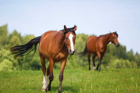 a pair of horses, portrait of animals in summer in a meadow, ecotourism