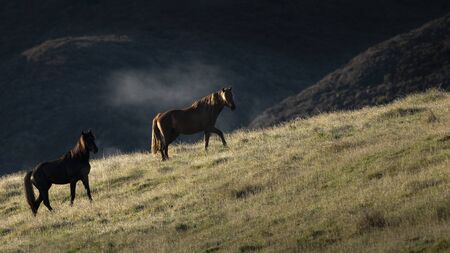 Beautiful bay horse herd grazes in the mountains at sunset, amazing hipster sunny natural background.