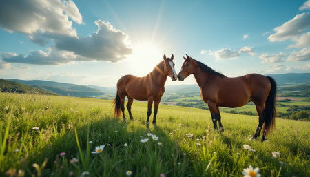 Two majestic horses share a tender moment in a sunlit meadow, surrounded by vibrant wildflowers. The golden sunlight casts a warm glow over the scene, highlighting the beauty of nature and the bond between these magnificent creatures