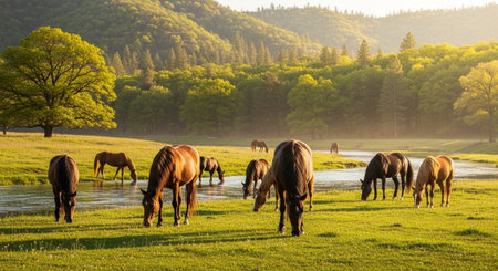 Horses graze peacefully in a lush green pasture, bathed in warm golden light, with a soft focus background showing the tranquility of rural life.