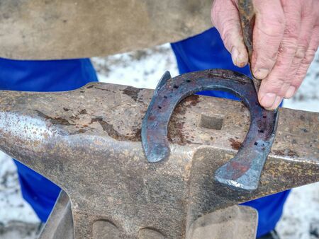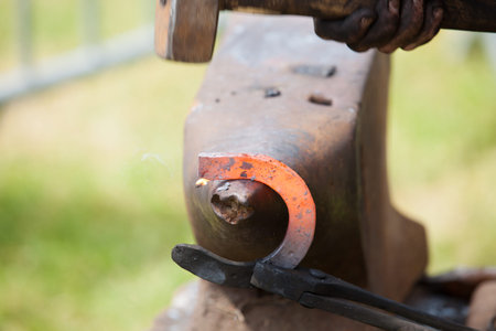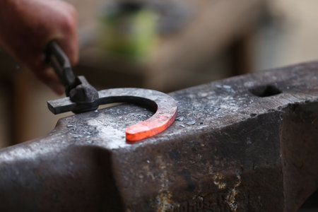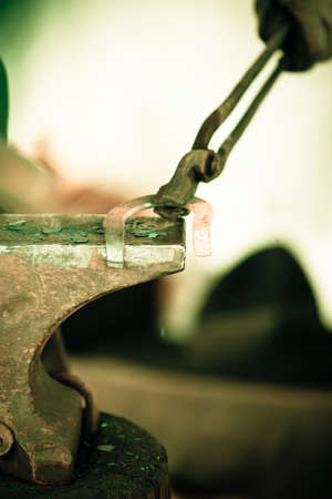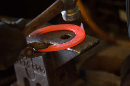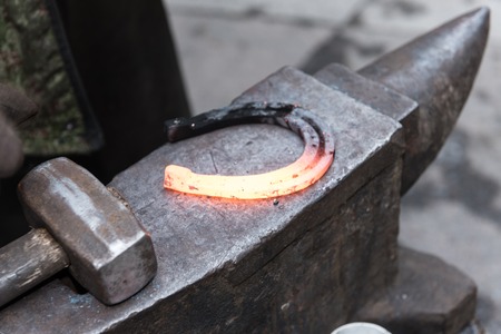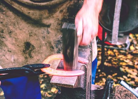 Horseshoe production process. A blacksmith bending hot metal on an anvil