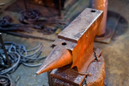 Big heavy anvil in the blacksmith's workshop, close-up, selective focus.