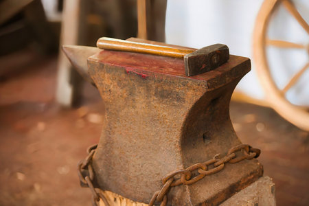 Close up photo shoot of hammer and anvil at dark smith workshop.
