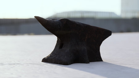 A striking blacksmith anvil sits on a light sandy surface, illuminated by natural sunlight. Its unique shape and texture create an interesting focal point in the outdoor setting.