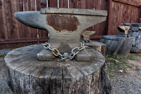 Big metal anvil on wooden log used by blacksmith to forge metal with heavy hammer in smithy