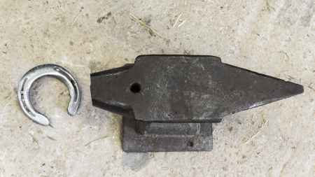Blacksmiths hammer and horseshoe on metal anvil at forge. Overhead view