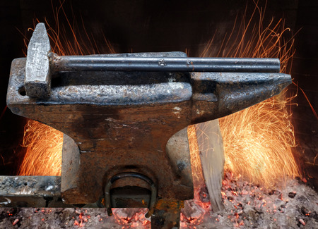 The blacksmith manually forging the molten metal on the anvil in smithy with spark fireworks, artwork