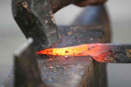 A craftsman/blacksmith working metal the oldfashioned way, with hammer and anvil and open fire
