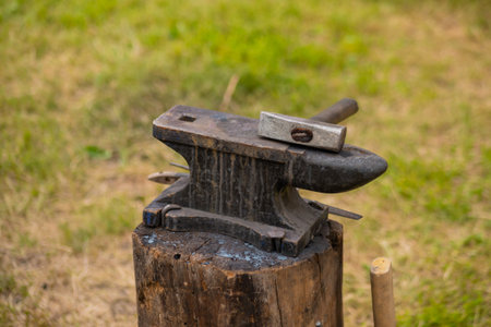 Hammer and blacksmith anvil at outdoor forge, workshop - close up. Handmade, craftsmanship and blacksmithing concept