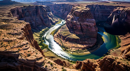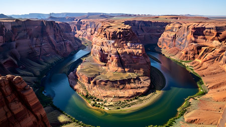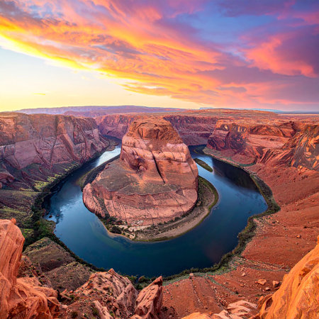 Majestic horseshoe bend of the colorado river winding through ancient red rock canyons