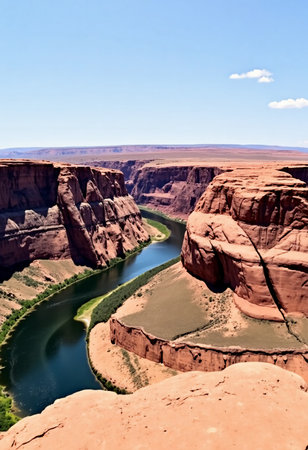 A river is winding through a canyon, with the water appearing to be green. The canyon is surrounded by mountains, and the sky is clear and blue. The scene is peaceful and serene