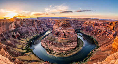 Majestic horseshoe bend panorama at golden hour showing the curving colorado river through ancient canyons