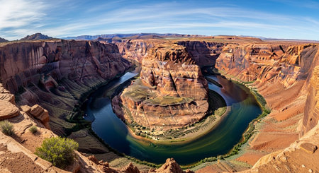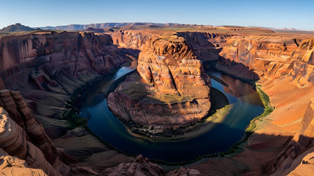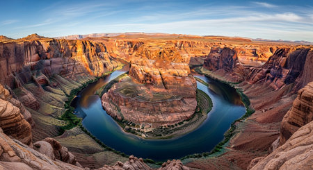An awe inspiring panoramic scenic view of horseshoe bend, famous outdoor canyon landscape in arizona. colorado river flows through magnificent red rock formation