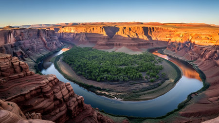 Golden hour view of Colorado river crossing a canyon in Page in Arizona USA