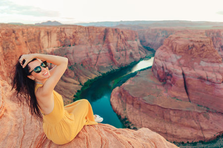 Beautiful woman on the edge of the cliff at Horseshoe Band Canyon in Page, Arizona. Beautiful nature in USA