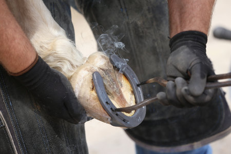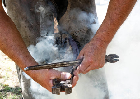 A closeup shot of a farmer fixing and polishing a horseshoe