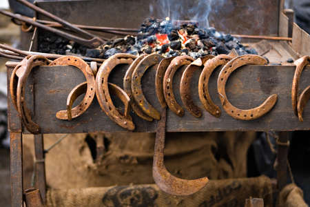 blacksmith forge and variety of horseshoes