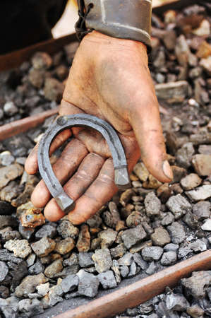 Detail of dirty hand holding horseshoe - blacksmith