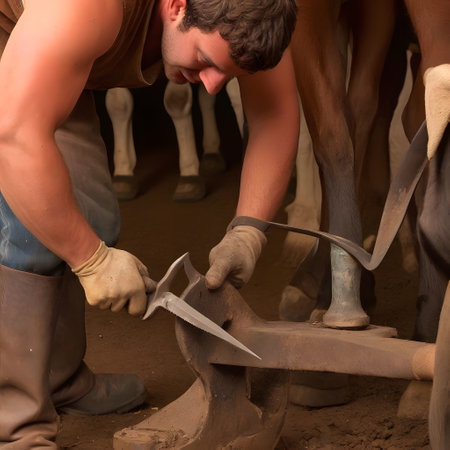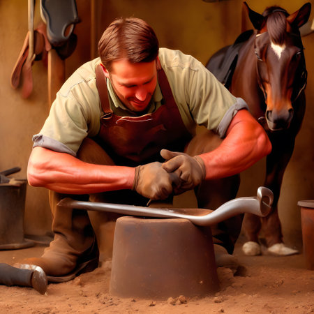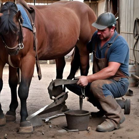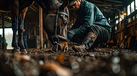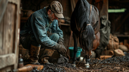 A farrier is working on a horse's hoof in a rustic stable, highlighting traditional animal care