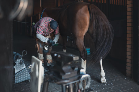 Farrier shoeing a horse in a stable, focusing on the process and tools used