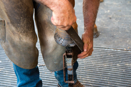 Blacksmith hands fits a horse shoe to horse hoof with a rasp.