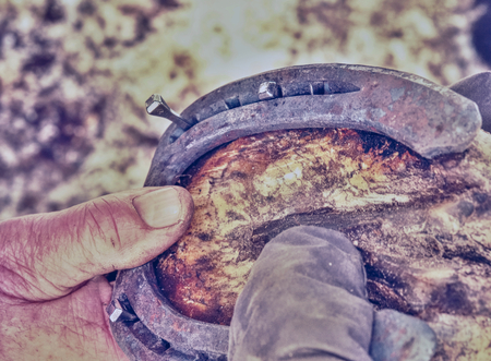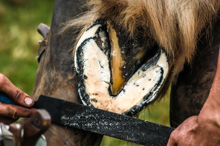 Horse's hoof, where a horseshoe is being removed for changing and cleaning the hoof