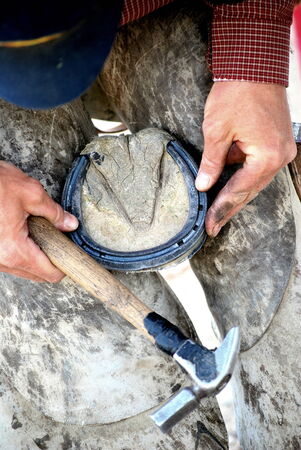 a Farrier with nail and hammer on a horses hoof, close up on the nail