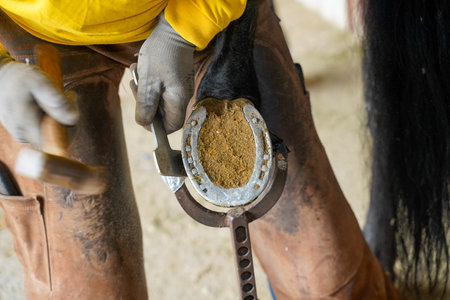 Farrier nailing horse shoe on horses hoof