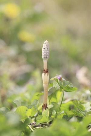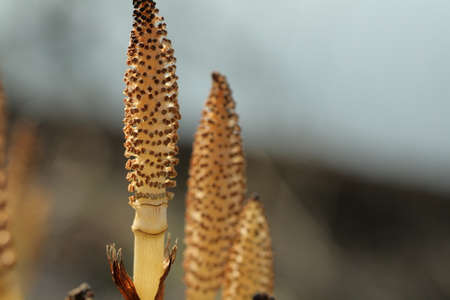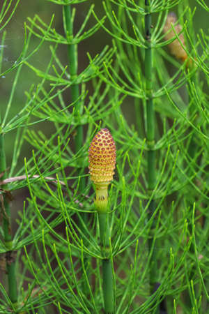 Common horsetail (Equisetum arvense) with a fertile stem growing in a spring forest, close up with selective focus