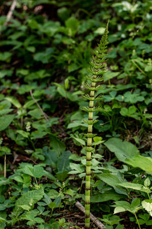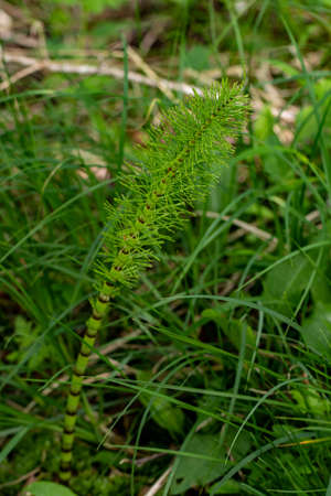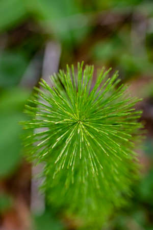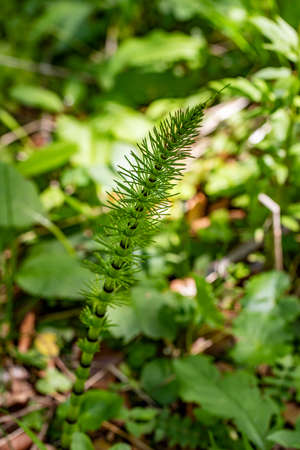 Beautiful young horesetails growing on the forest floor in spring. Equisetum plants in woodlands of Northern Europe.