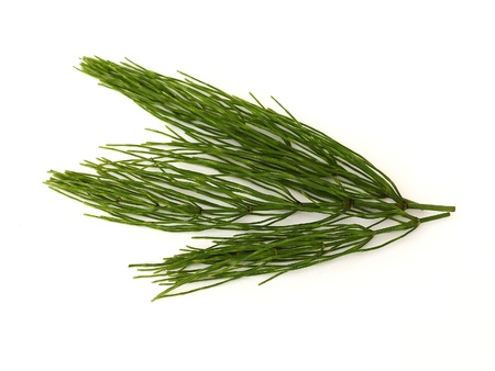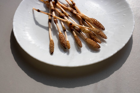 Horsetail is a perennial herbaceous plant with brown stems lying on a white plate