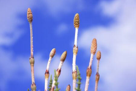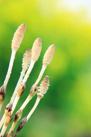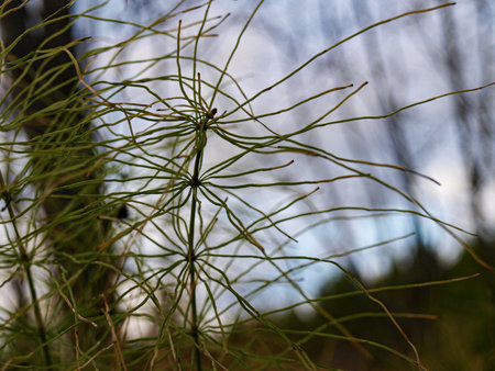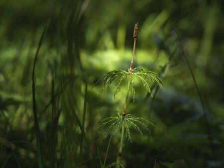 Horsetail - Equisetum grows in the meadow. In the background there is a beautiful bokeh created by the photography technique.