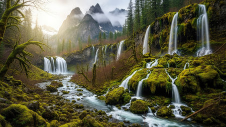 The image features multiple waterfalls cascading over moss-covered rocks in a vibrant green environment. The scene showcases clear water, a misty atmosphere, and tall green trees. Ideal for illustrating natural beauty, landscapes, environmental themes, or travel and tourism concepts. Suitable for a wide range of commercial and editorial uses.