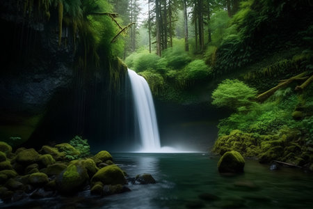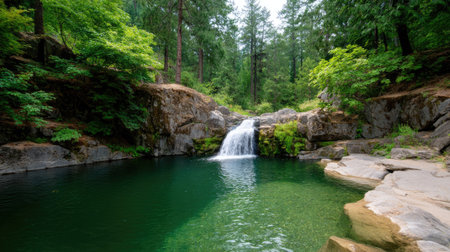 A picturesque waterfall cascades into a small pool in a dense forest. The image exhibits a naturalistic style with soft lighting, and features lush green foliage and tall trees. Ideal for illustrating natural environments, landscapes, or concepts related to serenity and conservation. Suitable for various editorial or commercial applications.