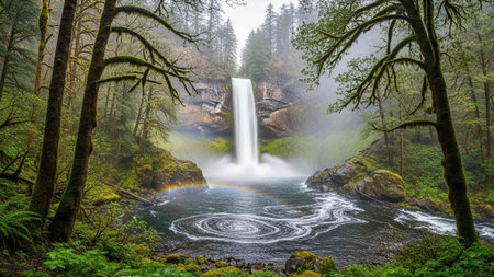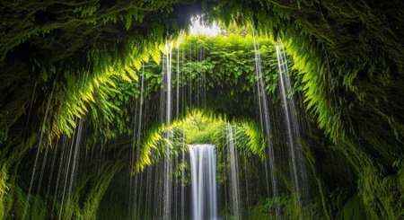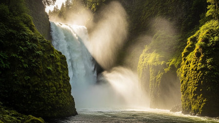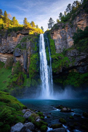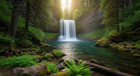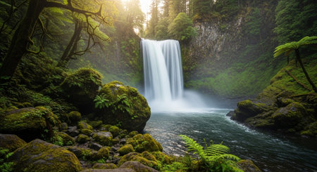 Stunning waterfall cascades down rocky cliffs surrounded by lush greenery and towering trees, creating serene and tranquil atmosphere natural landscape. sunlight filters through trees