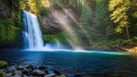 A powerful waterfall plunges into a turquoise pool, framed by vibrant green trees and moss-covered rocks. Sunbeams pierce through the foliage, illuminating the scene with a natural glow. The image showcases a tranquil, scenic landscape, suitable for various editorial and commercial applications.
