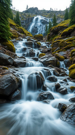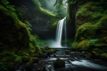 A stunning waterfall flows over moss-covered rocks within a vibrant green forest. The image showcases the dynamic movement of water contrasted by the stillness of the surrounding landscape. The scene, bathed in soft light, evokes a sense of tranquility. Suitable for various projects including environmental or travel-related content.