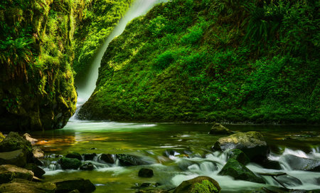 Pristine water flows through a rocky stream bed, reflecting the majestic waterfall cascading from the moss covered cliffs of a narrow gorge, creating a breathtaking natural landscape
