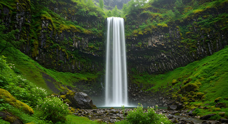 Majestic Waterfall Plunging Down Lush Green Basalt Cliffs