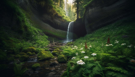 Tranquil scene of flowing water in forest generated by artificial intelligence