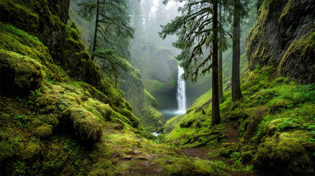 A tranquil forest scene showcases a cascading waterfall amidst verdant foliage. The image displays a natural composition with layers of green hues, from moss-covered rocks to towering trees. Soft lighting suggests a misty atmosphere. Suitable for use in projects related to nature, travel, or environmental themes.