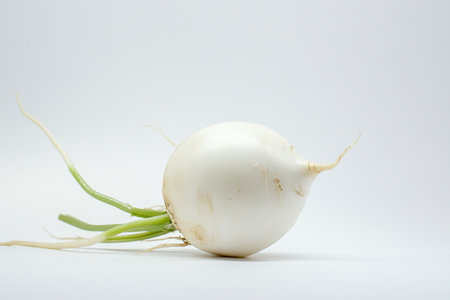 White turnip root vegetable with green sprouts on clean background. Fresh organic healthy ingredient for plant-based diet and culinary uses.