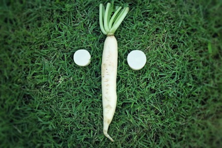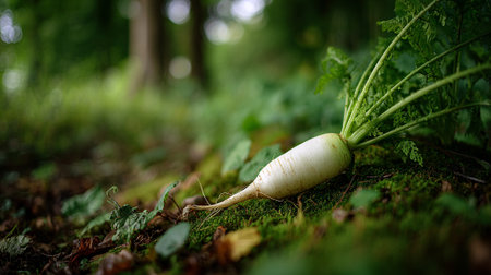 Fresh Daikon Radish with Lush Greenery Resting on Mossy Ground Outdoor