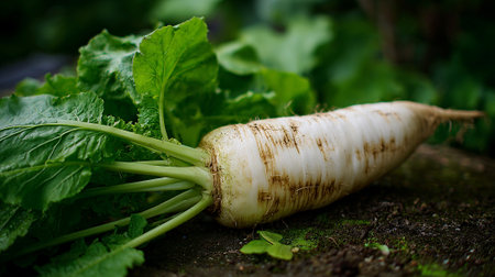 Freshly Harvested Daikon Radish with Vibrant Green Leaves Resting on Earth