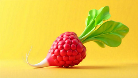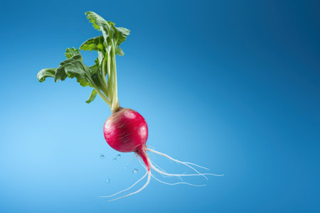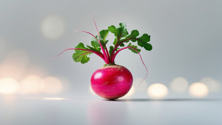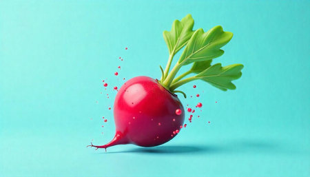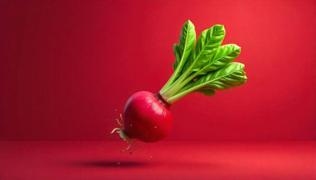 Bright red radish with lush green leaves stands out against a light green background, symbolizing freshness and vitality in healthy eating and nature-inspired cuisine.