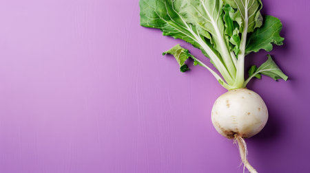 A white turnip with a long, thin root lies on a bright purple background. The turnip has a vibrant green top with large, leafy greens.